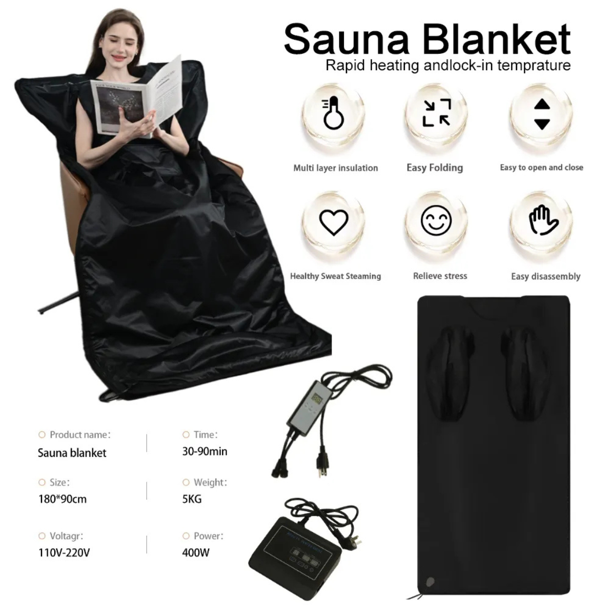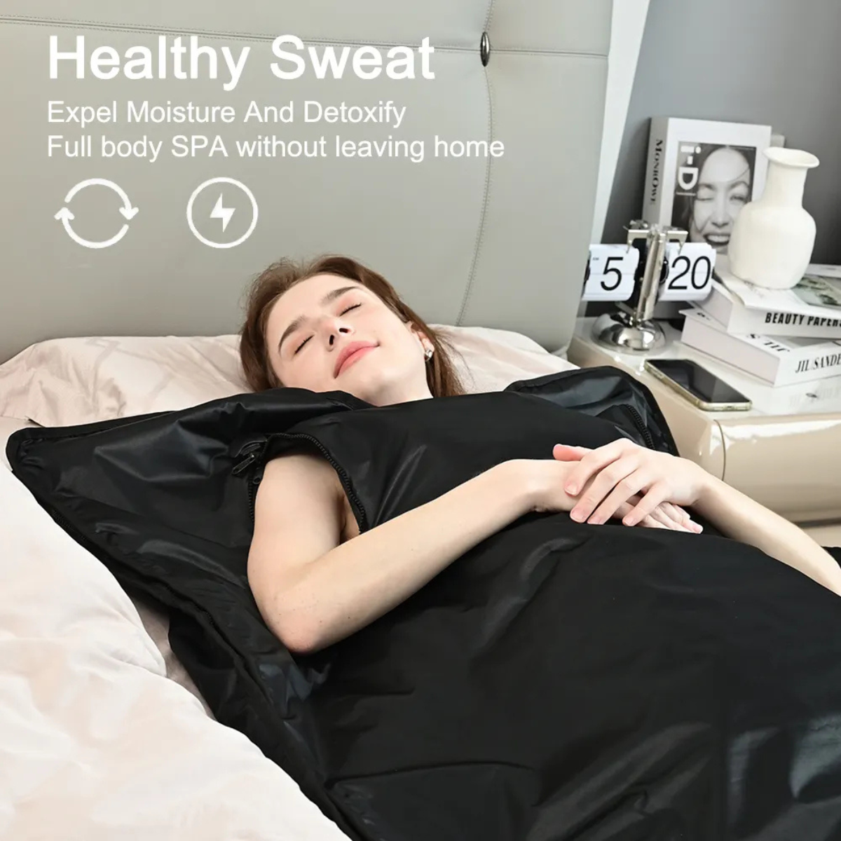 Unwind and revitalize your body with this sleek and stylish sauna Blanket designed to seamlessly blend into your urban lifestyle. Using a sauna Blanket daily can boost metabolism, relieve overall muscle tension, and contribute to improved cardiovascular health and improved wellness. Designed to be lightweight and portable, and crafted with a combination of high-quality materials, and with a Remote Control to effortlessly control the sauna experience You can enjoy the benefits of sauna therapy from the comfort of your own bed or sofa